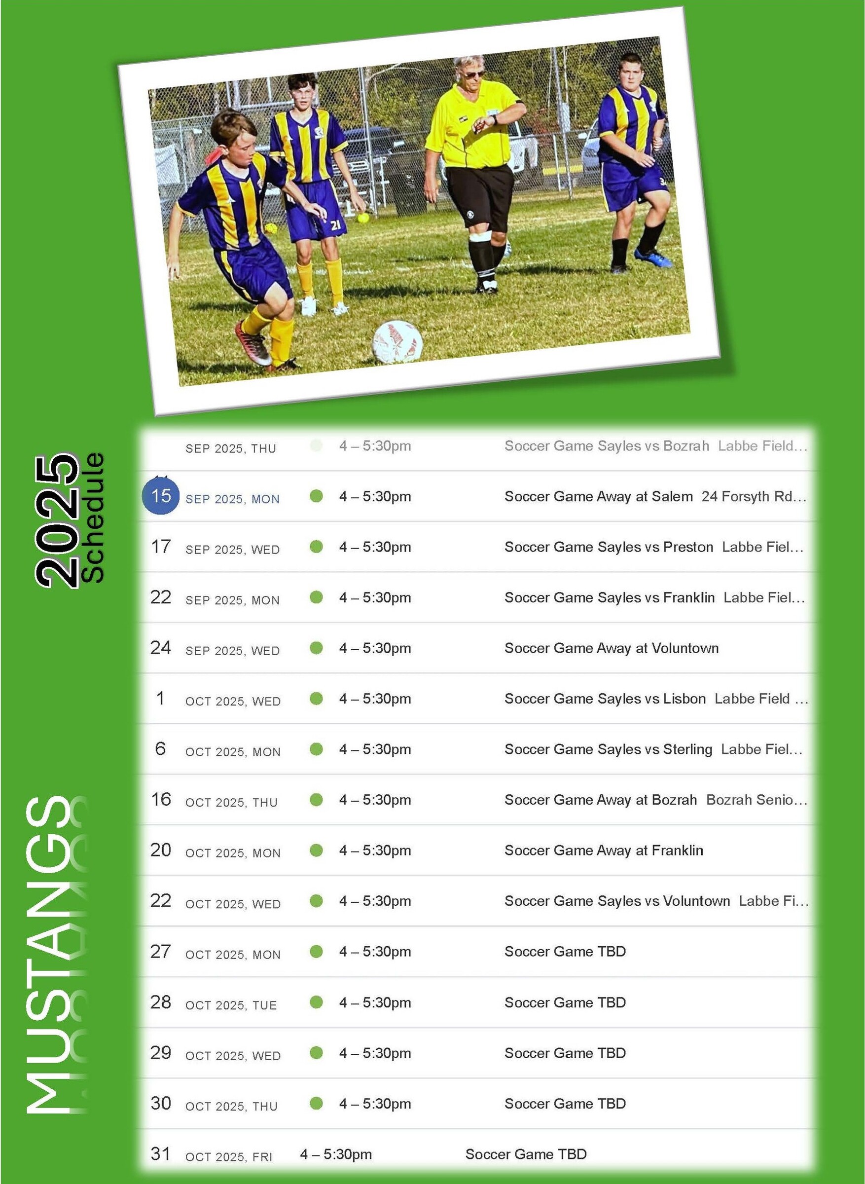 9/17/25 Sayles vs. Preston Sayles Mustangs lost to Preston five to one. The Mustangs were lead by a goal from Dillon peeler off of a fantastic corner kick from Logan Bergerson. The JV team lost two to zero but had fantastic goalie play from Jackson Walton that helped to keep the game within reach and great leadership from Emery Bergerson. The mustangs next game is Monday away at Franklin. Go mustangs!” |